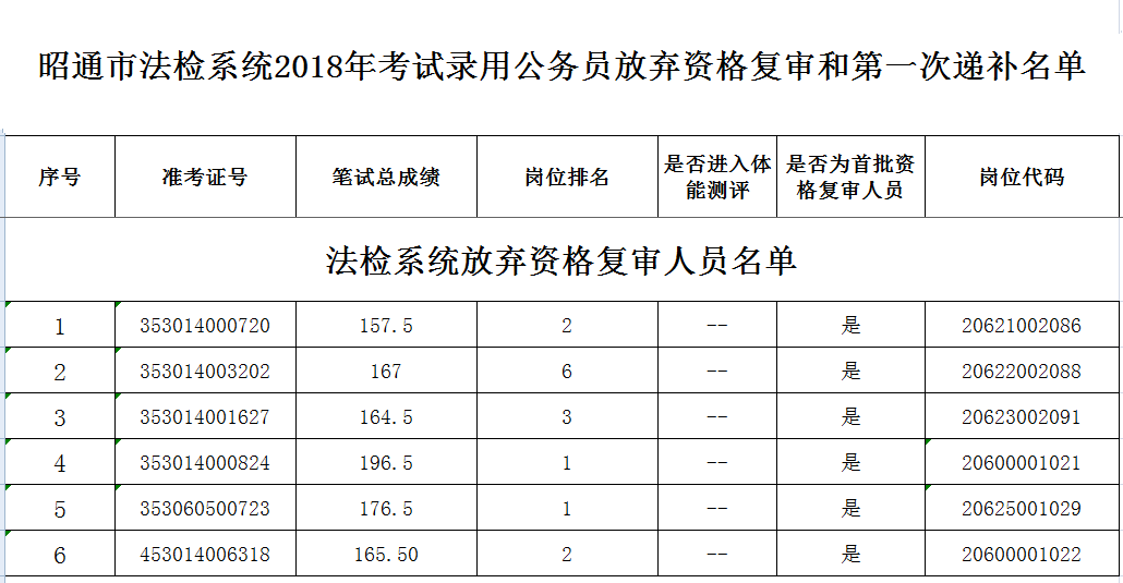 昭通市法检系统2018年考试录用公务员放弃资格复审和第一次递补名单