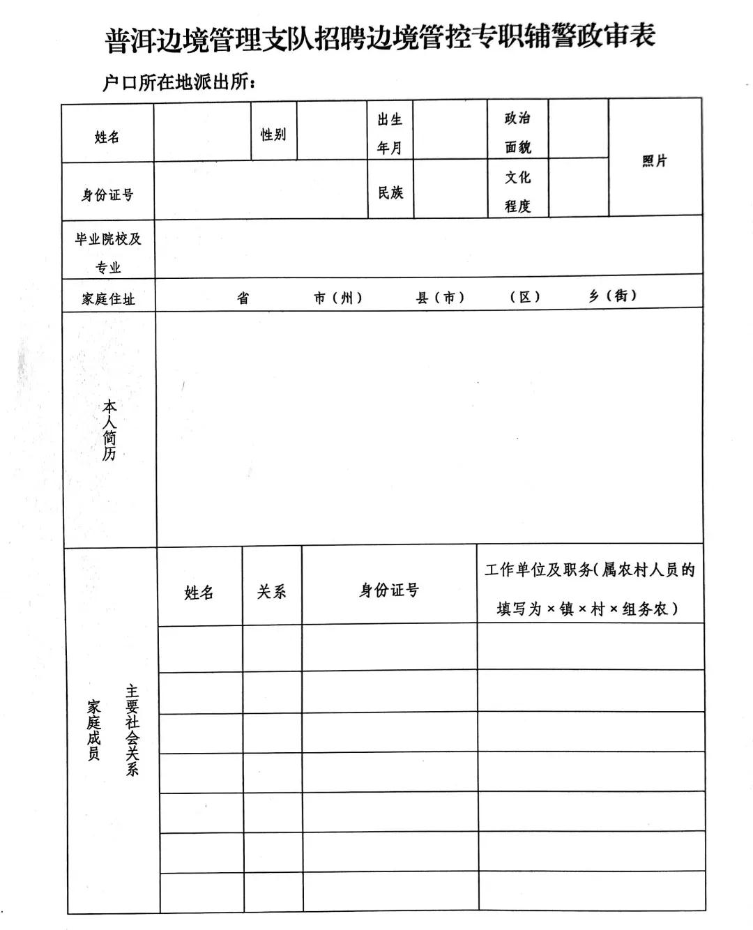1.普洱边境管理支队公开招聘边境管控专职辅警报名表