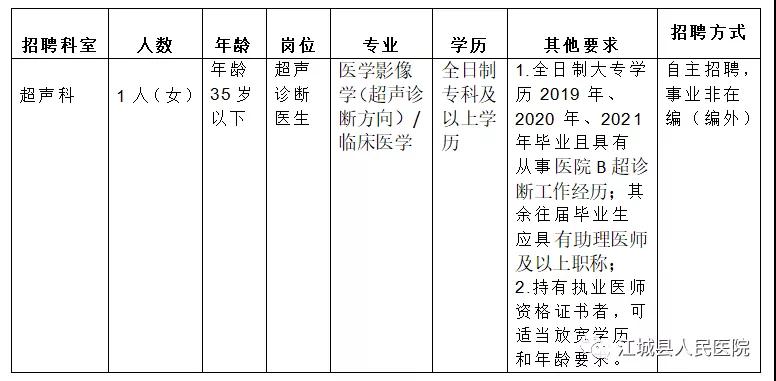 根据工作需要,经研究,江城县人民医院拟面向社会公开招聘B超诊断医师1名,现将有关招聘事宜公告如下: