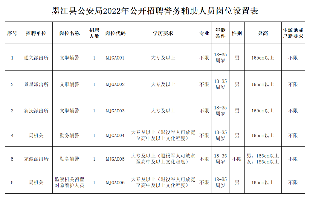 因工作需要,墨江哈尼族自治县公安局面向社会公开招聘警务辅助人员(公安辅警)6名。现将有关事项公告如下: