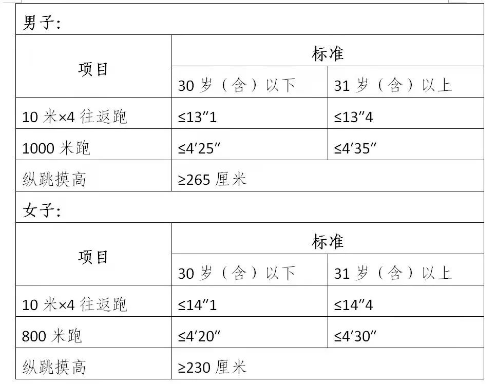 资格审核合格的人员进入体能测试,体能测试按照公安部《关于印发公安机关录用人民警察体能测评项目和标准(暂行)的通知》及其所附标准开展。体能测试的项目如下: