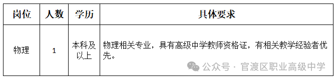为促进昆明市官渡区职业高级中学发展,加强学校师资力量,根据学校师资队伍建设规划及调整,现需面向社会公开补加招聘聘用制教师1人。现将相关事项公告如下: