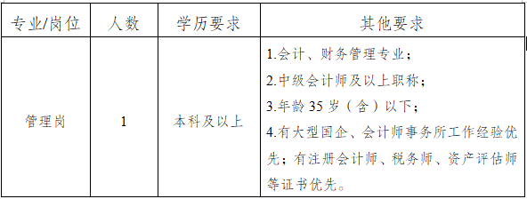 本次招聘财务管理岗人员1名。岗位设置及具体要求见下表。